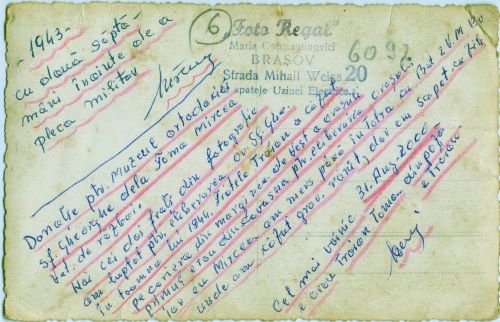 Pe verso scrie, a citit Florentina: „Noi, cei doi frați din fotografie, am luptat pentru eliberarea orașului Sfântu Gheorghe în toamna lui 1944. Fratele Traian a căzut pe cariera din marginea de vest a orașului, primul erou din Covasna pentru eliberarea orașului, iar eu, Mircea, am mers până în Tatra cu Bat. 2 V.M. (Vânători de Munte-n.red), unde am căzut grav rănit, dar am scăpat cu zile. Cel mai voinic e eroul Traian Toma.”