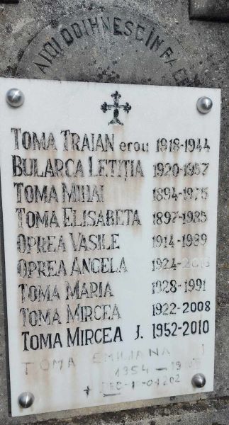 Aceasta este crucea familiei Toma din cimitirul din Covasna, Dumnezeu să-i odihnească! M-am dus chiar ieri în documentare în cimitir pentru că nu știam exact când era născut TRAIAN TOMA, era născut în 1918 (este primul de pe placă).