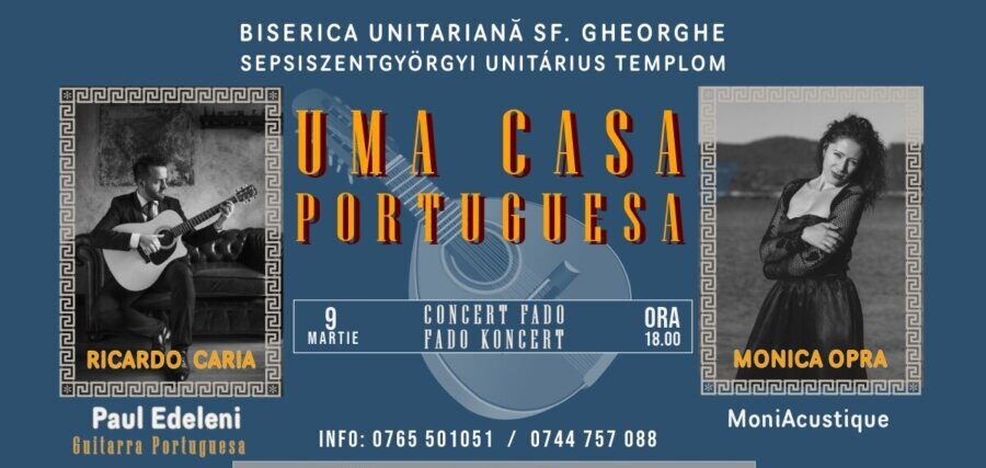 Un concert inedit și un spectacol muzical special va avea loc sâmbătă, 9 martie cu începere de la ora 18, la Biserica Unitariană din Sf. Gheorghe. Opra Monica împreună cu trupa MoniAcustique și invitații lor: Ricardo Caria și Paul Edeleni, vor călăuzi publicul în lumea fascinantă a muzicii fado, într-un decor desprins parcă de pe străzile Lisabonei.