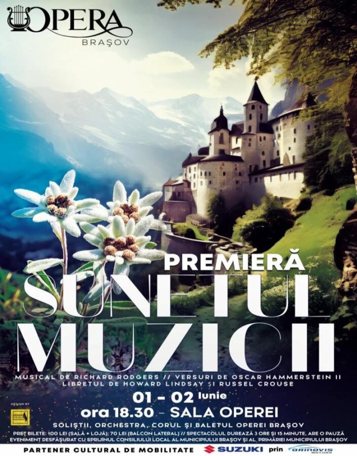 Așadar, sâmbătă, 1 iunie și duminică, 2 iunie 2024, de la ora 18.30, în Sala Operei va avea loc Premiera absolută la Brașov a celebrului musical „Sunetul muzicii” de Richard Rodgers (1902-1979), compozitor american, autor a 43 operete și musicaluri de pe Broadway și a peste 900 de arii și cântece de muzică ușoară!!!