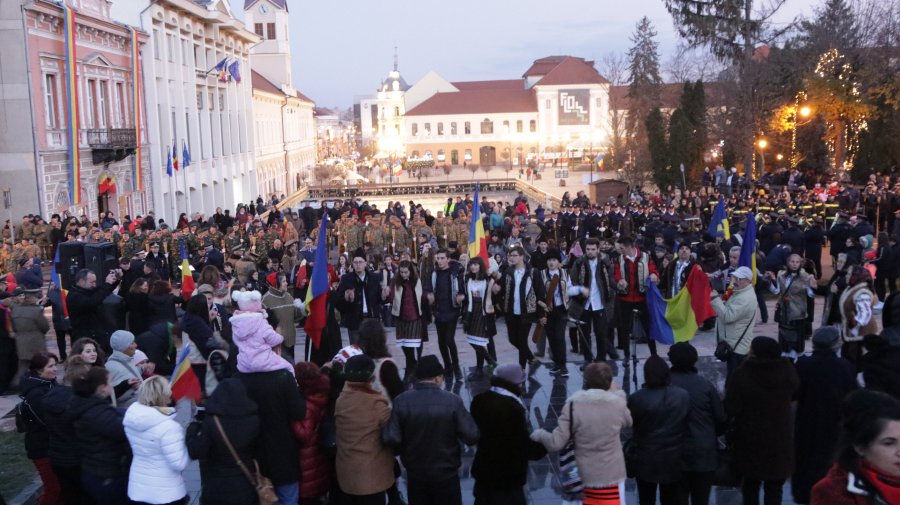 În Piața „Mihai Viteazul” îmbrăcată în steaguri tricolore, dar mai ales în bucuria de a fi împreună, participanții au urmărit ceremonialul militar şi religios precum și discursurile oficialităților.