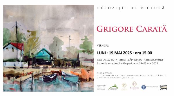 La Hotelul Căprioara din stațiunea Covasna are loc astăzi, 19 mai, de la ora 15.00, vernisajul expoziției pictorului Grigore Carată, organizată de SC Turism Covasna S. A. în parteneriat cu Centrul de Cultură Arcuș și Asociația Culturală „Predeluț”.