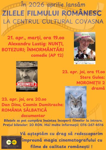 Zilele Filmului Românesc, care au debutat în data de 14 aprilie a.c., continuă la Centrul Cultural Covasna, cu încă trei producții.