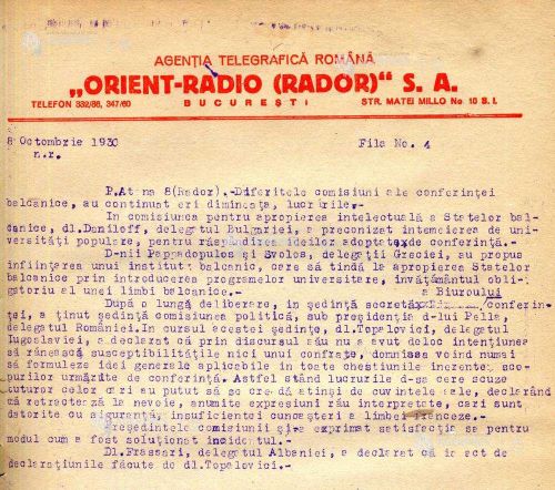 Ştire din arhiva RADOR/AGERPRES – Ştire despre Conferinţa Balcanică din 1930.
