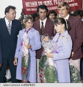 Fotografie de arhivă: Handbalistul Cristian Gațu (centru stg.) și gimnastele Nadia Comăneci (stg) și Teodora Ungureanu (dr), înaintea ceremoniei de decorare a sportivilor români, participanți la Olimpiada de la Montreal (Canada),1976