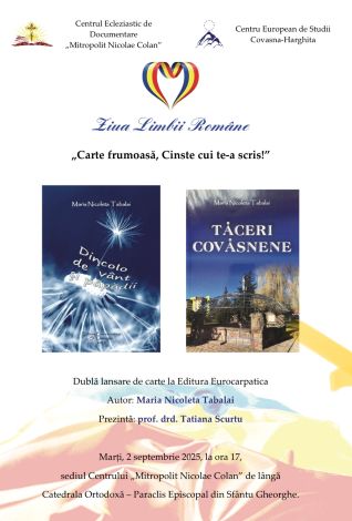 În organizarea Centrului European de Studii Covasna-Harghita (CESCH) și Centrului Ecleziastic de Documentare „Mitropolit Nicolae Colan”(CEDMNC), marți, 2 septembrie 2025, la ora 17, la sediul Centrului „Mitropolit Nicolae Colan” de lângă Catedrala Ortodoxă – Paraclis Episcopal din Sfântu Gheorghe, va avea loc un program ce va cuprinde prezentarea și lansarea a două cărți de poezie: „Dincolo de vânt și păpădii” și „Tăceri covăsnene”.