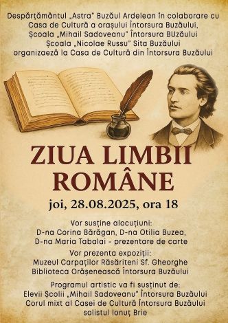 Casa de Cultură din Întorsura Buzăului va găzdui joi, 28 august 2025, de la ora 18, o manifestare dedicată Zilei Limbii Române. Evenimentul este organizat de Despărțământul „Astra” Buzăul Ardelean, în colaborare cu Casa de Cultură a orașului, Școala „Mihail Sadoveanu” din Întorsura Buzăului și Școala „Nicolae Russu” din Sita Buzăului.